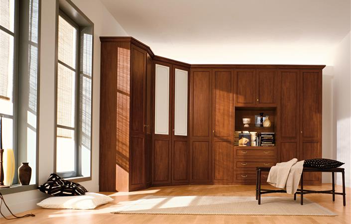 Un armadio disponibile in versione noce, avorio e bianco dove bugne, traversi, cornici, decori, vetri serigrafati e specchi arricchiscono la composizione a piacimento.