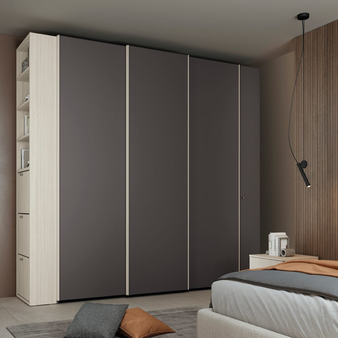 Il design minimal e i colori tenui rendono quest’armadio un luogo perfetto per il relax, arricchito dalla comodità della scarpiera