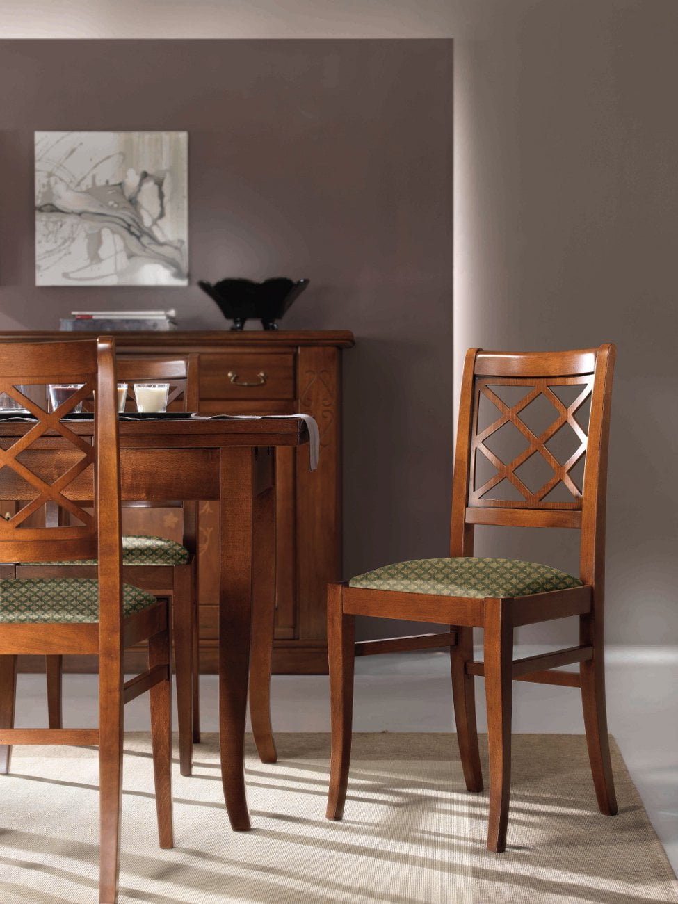Sedia in legno massello realizzabile in qualsiasi finitura con ampia scelta di rivestimenti.